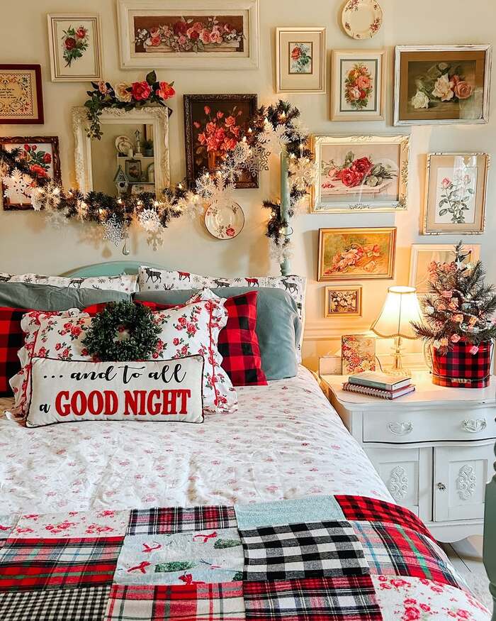 Copy the vibe of this red and white xmas bedroom by choosing one large-scale print and several small ones. Keep your whites creamy so the vintage frames feel at home. Use a patchwork quilt to bridge patterns, and let the pillow prints echo the shapes in your art. If you’re scared of a gallery wall, start with five frames and grow. Add a frosted garland across the frames for December only, then stash it in a bin labeled clearly so January-you doesn’t curse December-you.