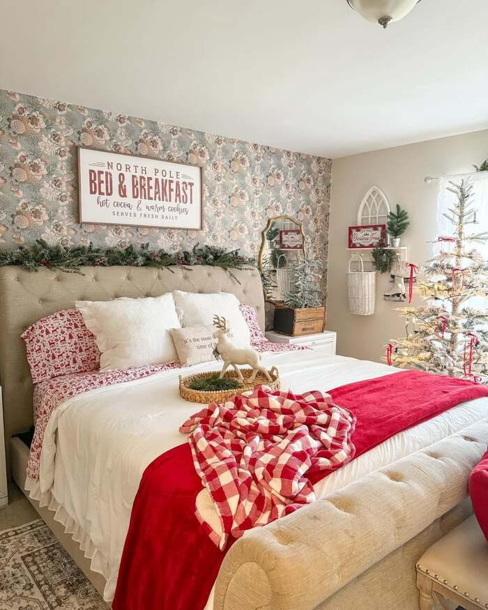 Same wallpaper family as the first, but with a playful sign that says Bed & Breakfast. That one piece makes the whole room smile. Red toile sheets peek out from white linens, and a candy cane blanket curls along the edge like a ribbon on a present. A woven tray with a gold deer adds height without clutter. Flocked tree in the corner catches the light and doubles the magic in the mirror.