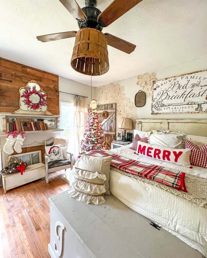 This room is full of memory. Weathered furniture, ruffled throw, a sign that reads Bed and Breakfast, and a skinny red tinsel tree sparkling beside the bed. The bedding mixes ruffles with plaid runners and a long “MERRY” lumbar that acts like a banner. The wood bucket turned light fixture made me grin. Imperfect and charming.