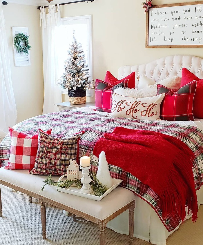 This is the polished cousin of the cottage room. Tufted beige headboard, crisp white base, and then a whole party of plaids. Giant pillows in red windowpane, smaller ones in mixed tartans, and a glowing red throw at the foot. A small tree sits on a nightstand in a woven basket so the texture repeats. The bench tray with a little ceramic house and candle makes bedtime feel like a ritual.