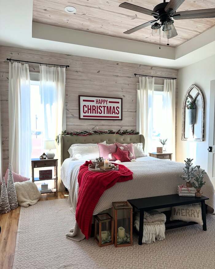 This room balances rustic and airy. A pale plank wall and matching ceiling tray make the space feel designed without feeling heavy. A simple sign reading Happy Christmas sits right above a headboard trimmed in garland. Neutral knit bedding becomes the snow, and cherry red pillows and a thick throw bring the peppermint. Lanterns on the floor with battery candles add glow at night.