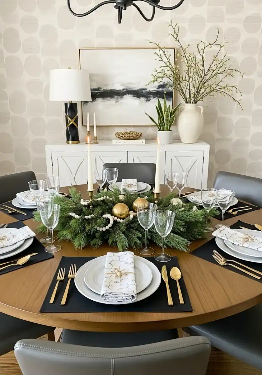 If you crave shine, try this glam setup. Start with champagne gold chargers and white plates, then add crisp white napkins with metallic rings. In the center, mix evergreen branches with floating mercury glass orbs and a chunky mercury vase. Scatter tea lights in gold holders for little starbursts. It’s round table festive decor that feels expensive even if most was thrifted.