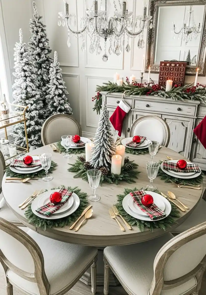 Last idea and it’s winter wonderland. A small flocked tree sits in the center, surrounded by fresh pine sprigs, pinecones, and battery candles. Each plate has a plaid napkin topped with a single shiny red ornament. The room itself has frosted garland, so the table repeats the theme without going overboard. I like how the green wreath-style chargers outline every plate like mini forests.