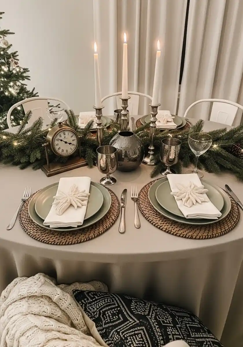 This look feels like New Year’s Eve met a cabin. I layered woven chargers to ground the place settings, then used soft sage plates so the table didn’t feel loud. Tall taper candles in silver holders add height, which is important on a round surface because it draws eyes upward and frees elbow room. A low garland of cedar and fir keeps everything connected, like a green river running through. My confession is I almost skipped the old-fashioned desk clock, but it’s the quirky piece that makes guests smile and it whispers party time. For Christmas round table decor, one oddball item gives character.