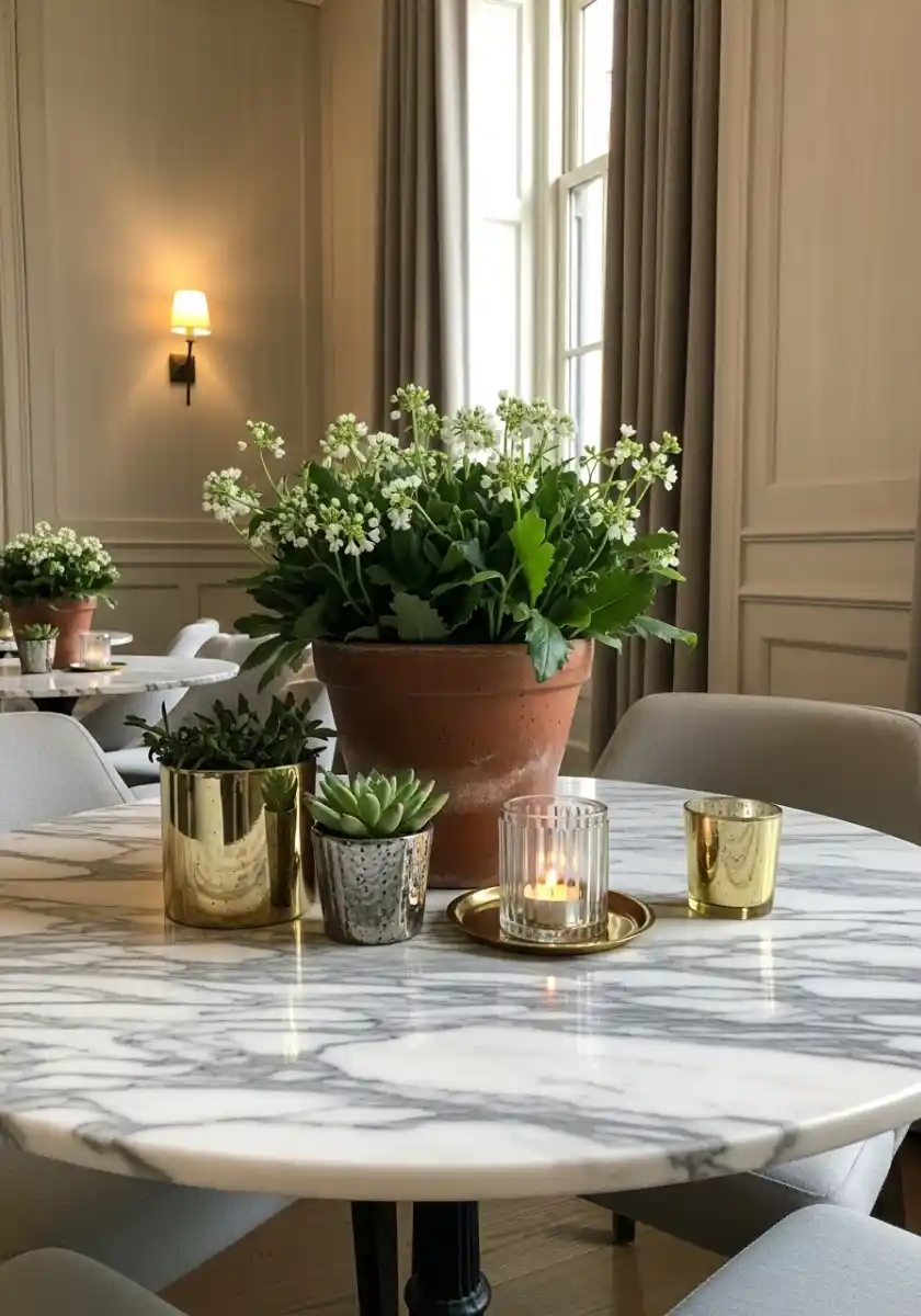 Sometimes simple wins. On a white marble round top I used one clay pot overflowing with white blooms and two small succulents in metallic cups. Then I scattered a few gold and glass votives on a tiny tray. It’s clean, breathable, and super renter friendly. I like this for a breakfast nook or small round kitchen table Christmas decor when you still need room for pancakes. The soft plant shapes keep it from feeling cold.