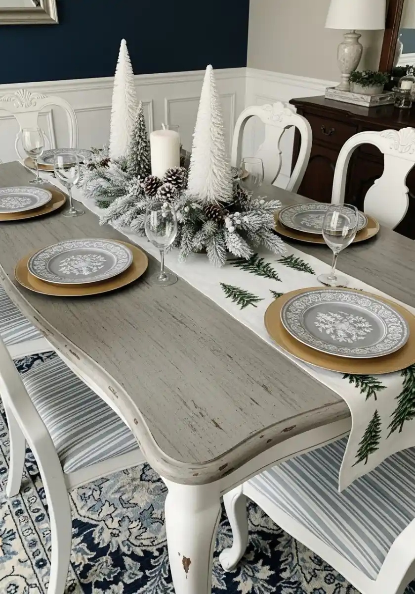 Ok, this one screams winter wonderland. I lined the center with a white runner and set frosted bottlebrush trees with pinecones and dusted greens. Even though I first saw it on a rectangular table, I tested it on my round pedestal table and it still works. Think triangle: tallest trees in the middle, smaller ones stepping down so no one’s view gets blocked. This doubles as round family table holiday decor that looks fancy but is honestly plug and play.