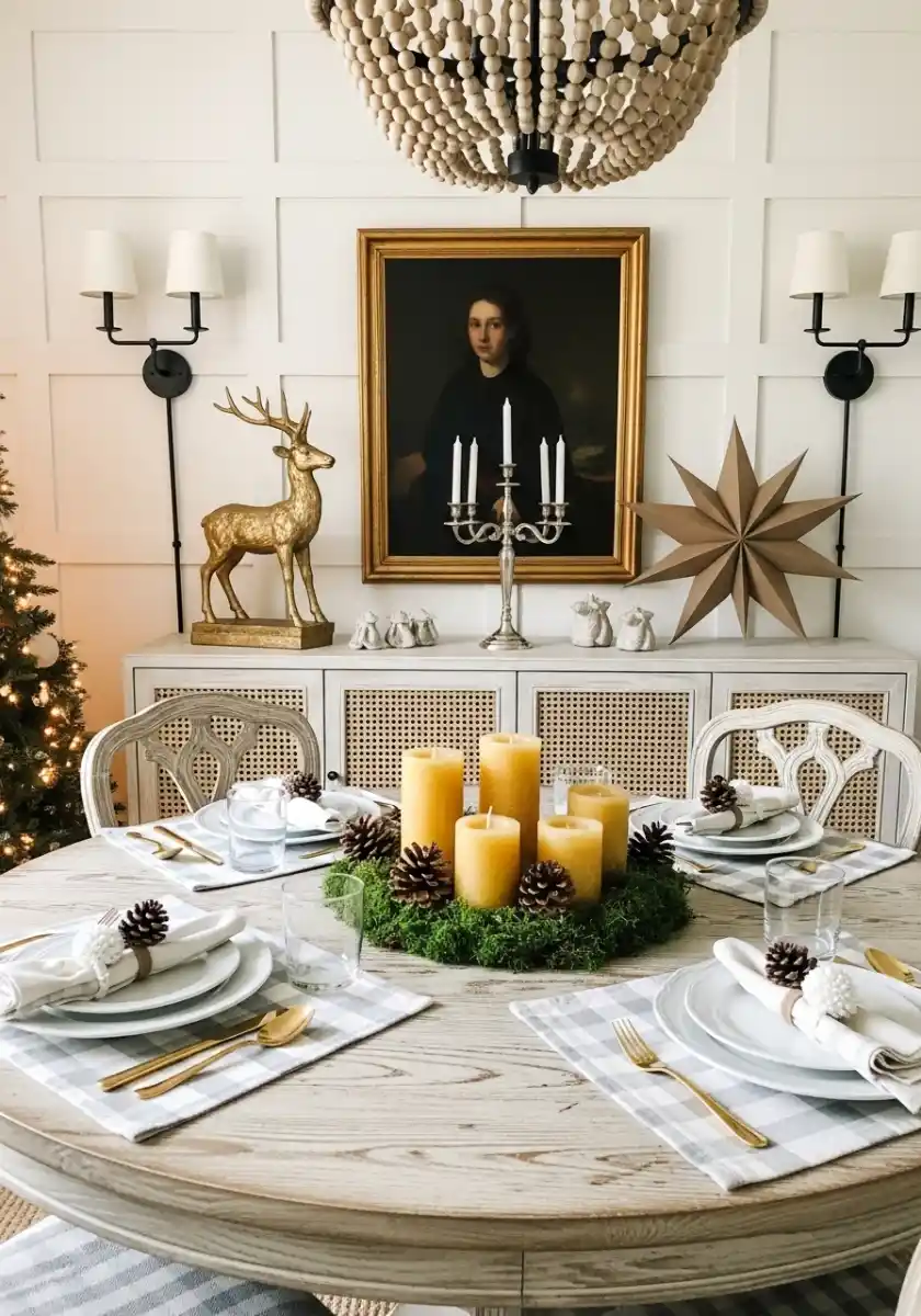 This setup gives me historic library vibes. I placed a thick moss wreath in the center and nested a cluster of honey-yellow pillar candles inside. Pinecones scatter like it snowed just a little. The warm candle color fights winter gray skies, and the moss adds plush texture you can almost pet. For round dinner table Christmas decorating ideas, a circular centerpiece mirrors the table shape, which always looks intentional.