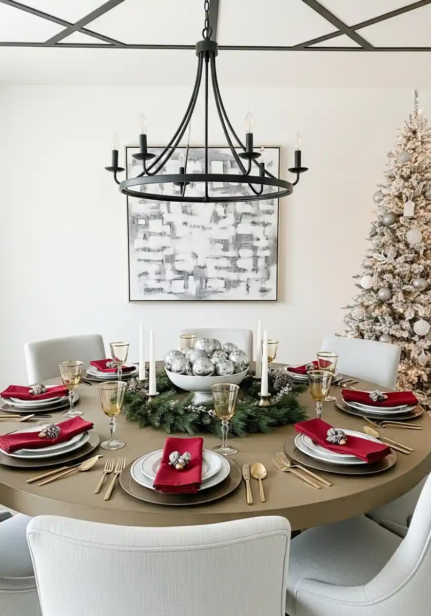 Here’s the classic movie moment. Crisp white plates, gold flatware, and cherry red napkins clipped with little silver bells. In the center, a low bowl piled with silver ornaments sits inside a wreath of greenery, and white tapers stand straight like choir singers. This round dining table Christmas decor mix of red, gold, and silver feels timeless but fresh because everything sits low and wide.