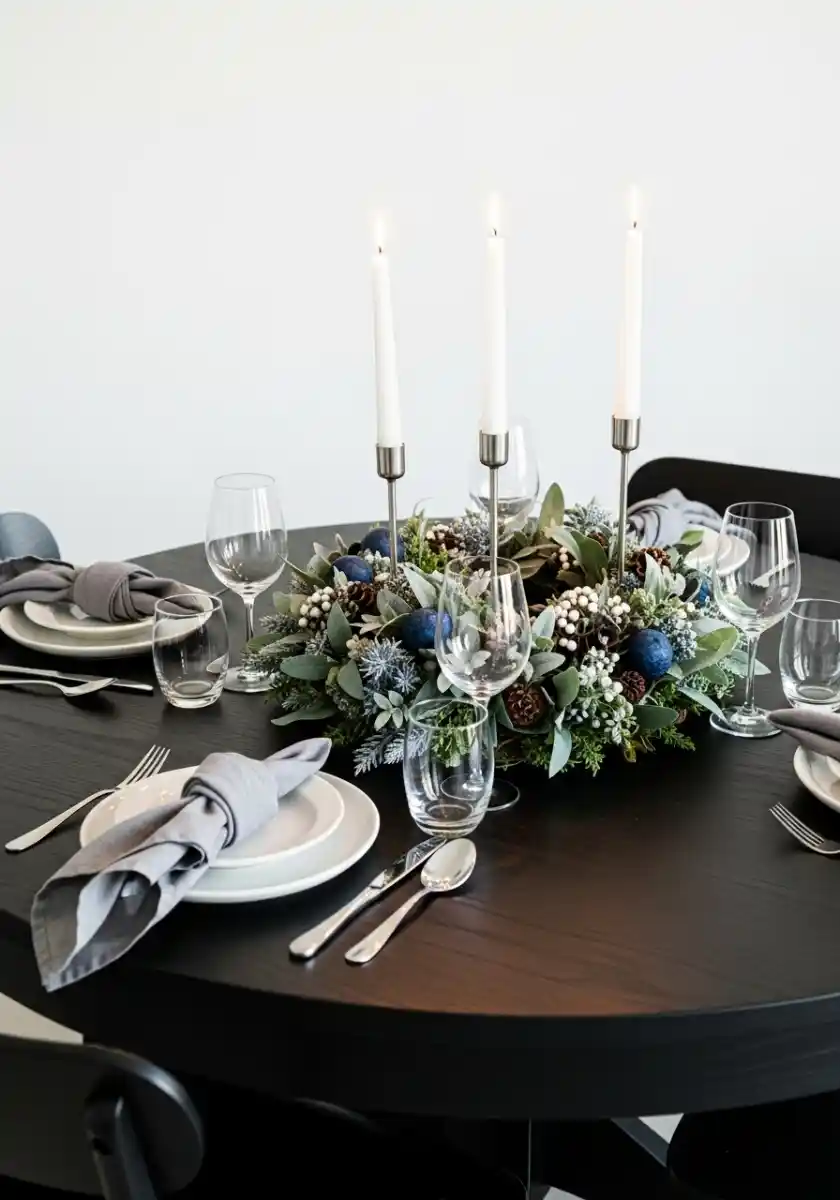 I’m a sucker for a cool palette. This one uses eucalyptus, frosty greens, pinecones, and a few deep blue ornaments tucked inside the foliage. Three slim silver candlesticks pierce through like moonlight. Paired with gray napkins on white plates, it reads calm and chilly, in a good way. When you want round table christmas centerpieces that lean modern, steer into cooler tones.