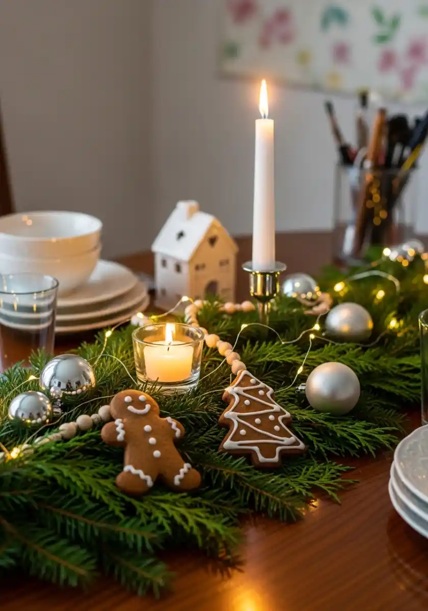This is the kid-pleaser in my home. I ran fresh greens across the center and wove a tiny wooden bead garland with a short string of battery lights. Silver baubles bounce the sparkle. Then I added a mini ceramic house and hung gingerbread cookies on twine. Yes, real cookies. Guests nibble them after dessert and it becomes a story. For round table holiday decor that feels charming and handmade, this wins.