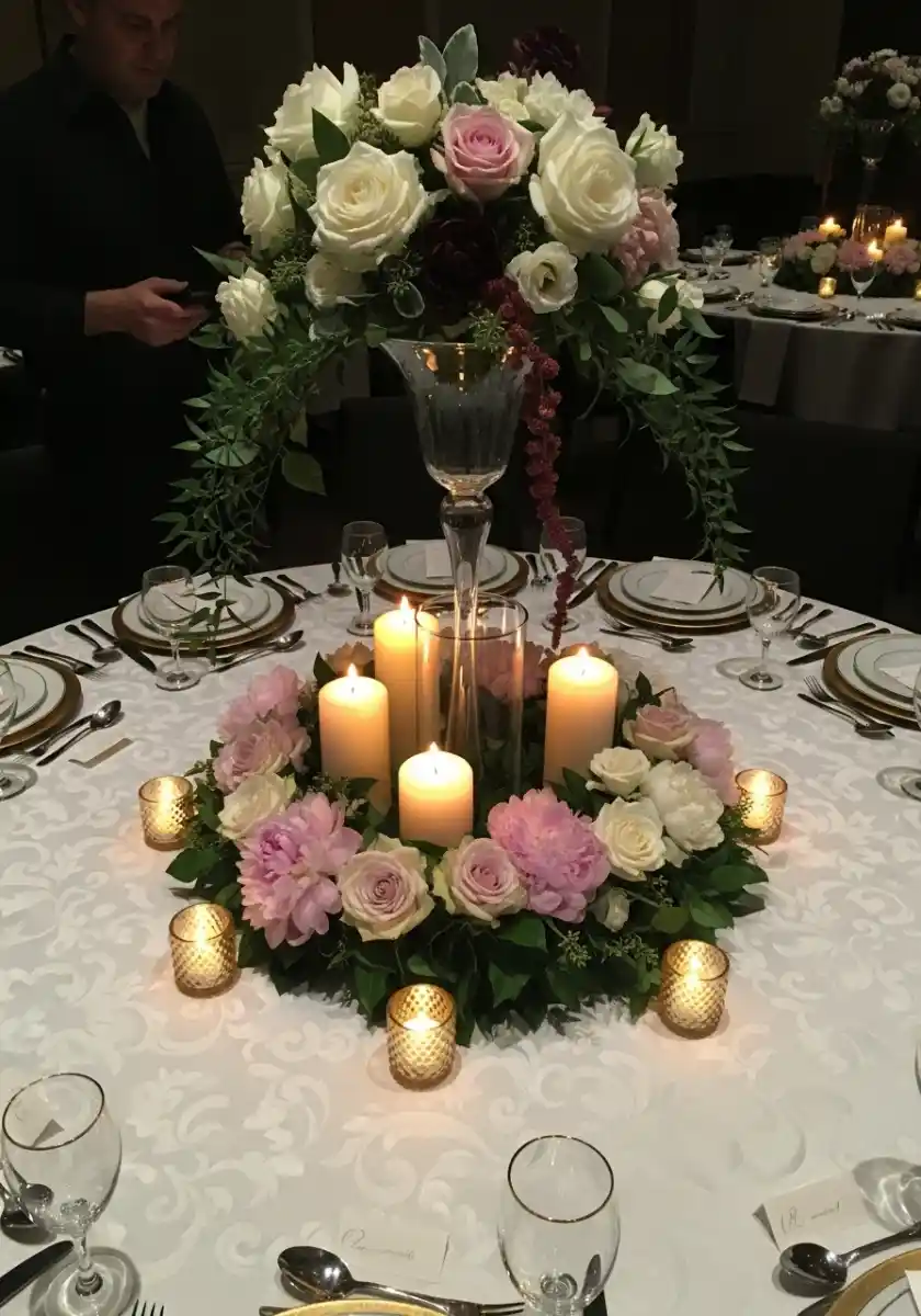 This one looks glamorous and it smells like a flower shop in the best way. A glass vase holds a layered bouquet of roses and draping greenery. Around the base I set a low ring of pillar candles surrounded by faux peonies and ivy. The trick is height control. The tall piece stays in the middle, but the lower ring stays below eye level so people can talk across the table. I gotta admit, I was worried it’d feel too wedding. But the warm candlelight and dark room made it cozy, not formal.