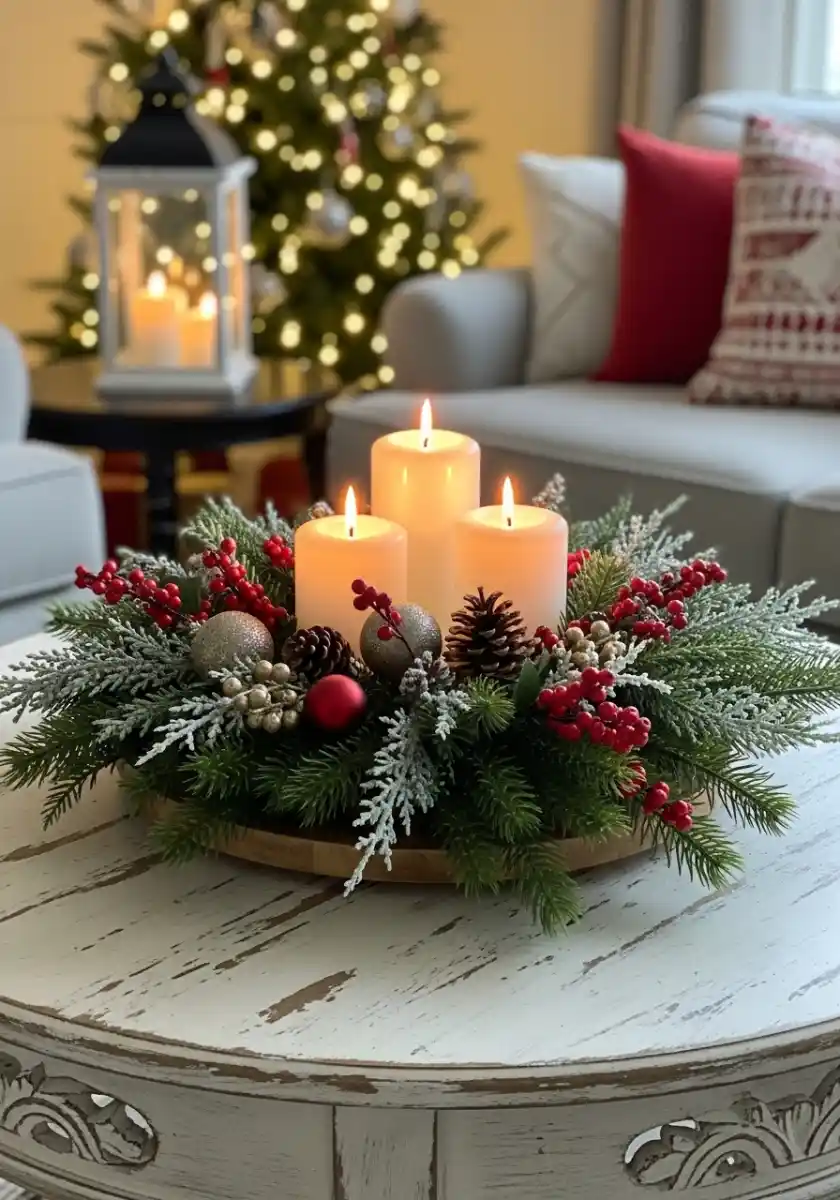 Not every gathering happens at the dining table. For a circular coffee table, I use a wide wood tray, three pillar candles of different heights, snowy greens, pinecones, berry picks, and a couple shimmery ornaments. It’s low and safe around kids, but still glows like crazy. Even from the sofa you feel wrapped in the season. This doubles as Christmas round table decor if your dining table is tiny and you set plates buffet-style.