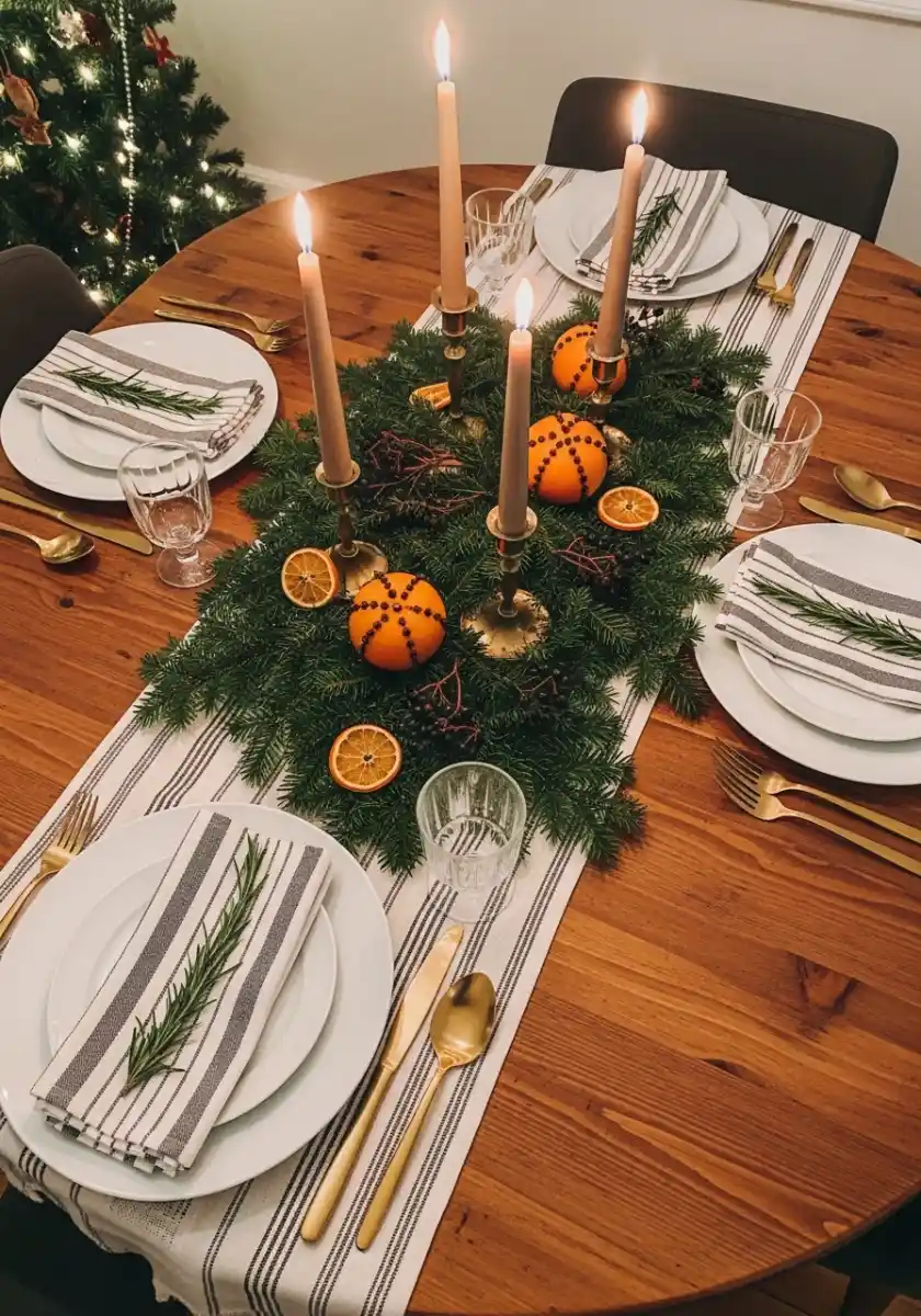 This look smells like the holidays. The runner is simple stripes, the centerpiece is a thick bed of real evergreen branches, and on top go four brass tapers, studded oranges, and dried orange slices. It’s classic and bright at the same time. I stick whole cloves into the oranges in easy crisscross rows. It takes 10 minutes and makes the room smell better than any candle. Keep the plates white and napkins striped with a sprig of rosemary so the color story stays calm.