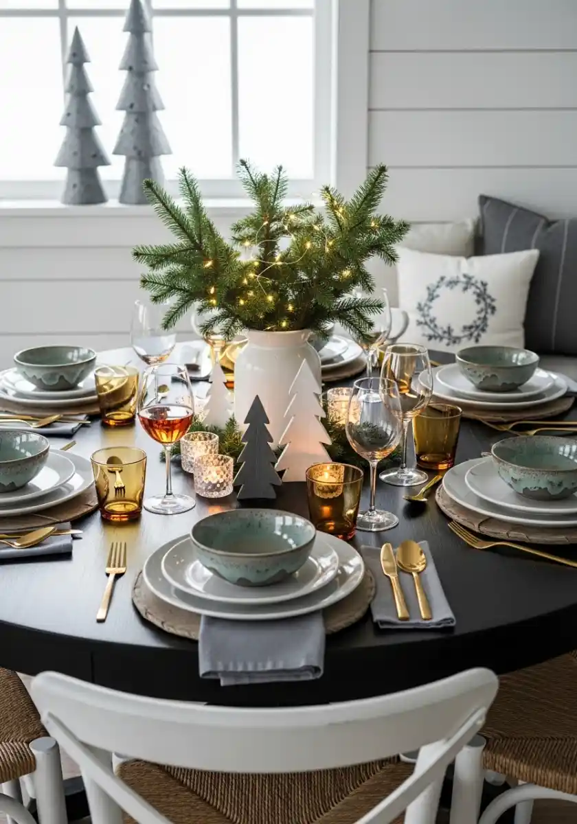 This idea is pure cottage vibes. A matte black round table, stoneware bowls, and a little tree tucked into a white pitcher wrapped with micro lights. Votives add the sparkle without blinding anyone. I love the mix of gray napkins and amber glasses. It warms the cool palette and makes soup look photogenic. Pro tip that I learned the hard way. Put a tiny bowl under the tree so water doesn’t drip on your table.