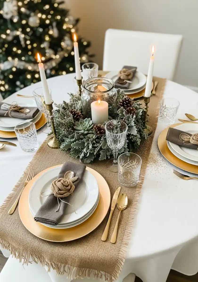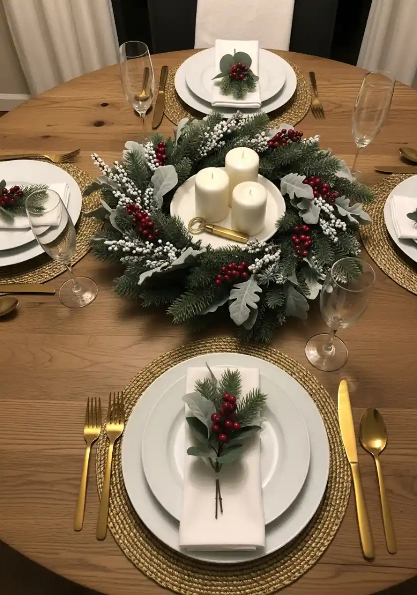 This plan is peaceful. A fluffy wreath sits on a shallow platter with white pillar candles in the middle. Dusty miller leaves, red berries, and tiny white bead clusters give it a frosty look. Each place setting has a gold woven charger, plain white plates, and a napkin topped with a small sprig and berry pick. It’s traditional but not stuffy. My guests said it felt like eating in a winter garden.