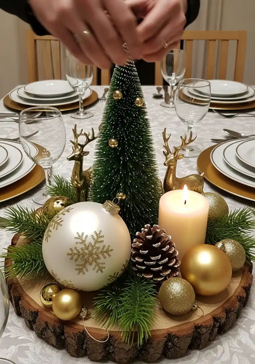 To keep it classy, don’t overstuff the greens. Leave breathing room so the metallic surfaces can catch candlelight. My favorite trick is to place a small mirror tile under the tallest piece. Reflection doubles the glow without adding more items. If you want round dining table Christmas decorations that look hotel-lobby level pretty but still family friendly, this one hits the sweet spot.