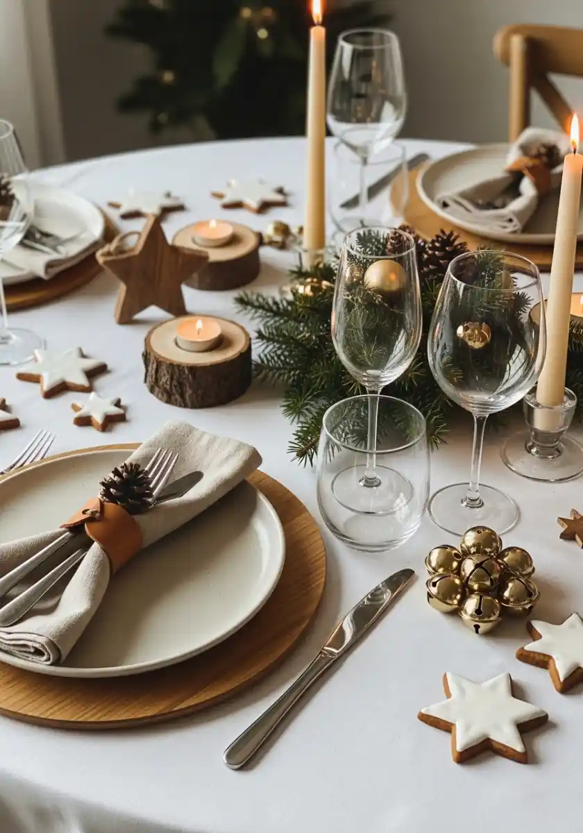 This scene is soft and Scandinavian. White cloth, pale plates on wood chargers, leather napkin rings with tiny pinecones, and lots of little star shapes. Wood tea light holders make it feel handmade. The greenery is kept low and neat, so you can actually pass the salt without drama. I love how the gold bells tie in with the flatware. It’s quiet but not boring.