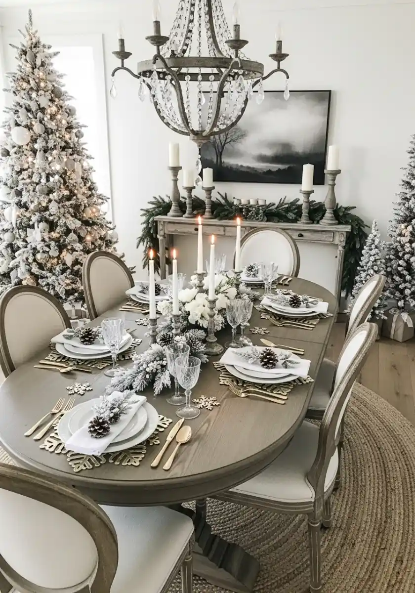 If you want winter wonderland, this one sings. Frosted garlands snake down the center with clusters of crystal goblets, slim tapers, and white florals. Place settings stack from snowflake placemats up to white plates with a pinecone sprig on top. It looks expensive because everything is tone on tone. You can fake the frost with a can of snow spray on plain branches. Works fine.
