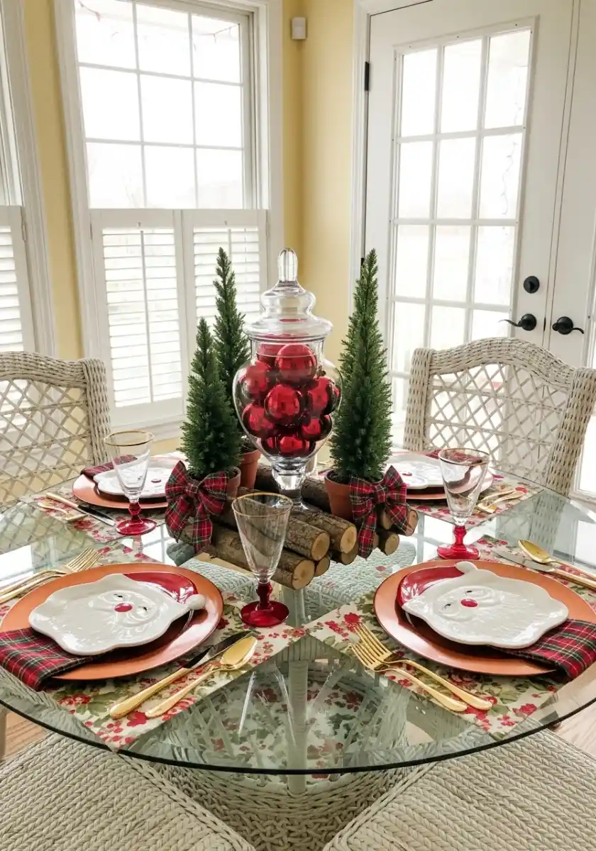 This idea screams kid-friendly without feeling cheesy. I set a clear apothecary jar full of shiny red balls on a bundle of little birch logs. Two mini trees in clay pots flank the jar. I tied plaid bows around each pot, which makes the center feel like a tiny forest. Santa plates sit on top of plaid napkins, and gold flatware adds a bit of sparkle. The circular shape of the jar keeps the round table Christmas centerpiece simple, and it’s easy to move when you pass pancakes.