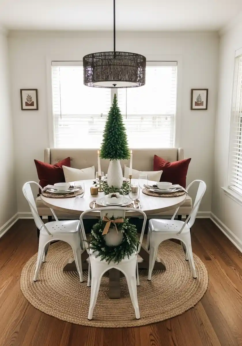 Consider this your relaxed round dining table Christmas decor for weeknights. Use handmade or thrifted bowls to keep it personal. If your chairs are white, echo that with simple ceramic trees. No need to overthink. The scale is right for small rooms and apartments. It’s the definition of stress free Christmas decor for a round table.