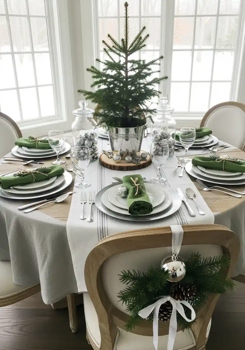This is clean and crisp and kind of addictive to set. A potted mini fir sits on a wood slice. A narrow runner runs straight through the center, and clear jars filled with silver ornaments flank the tree. Green napkins are rolled and tied with twine, then finished with a tiny pine cutting and a silver bell. The cutest touch is the mini wreaths tied to the chair backs with white ribbon. Everyone who sits down smiles.
