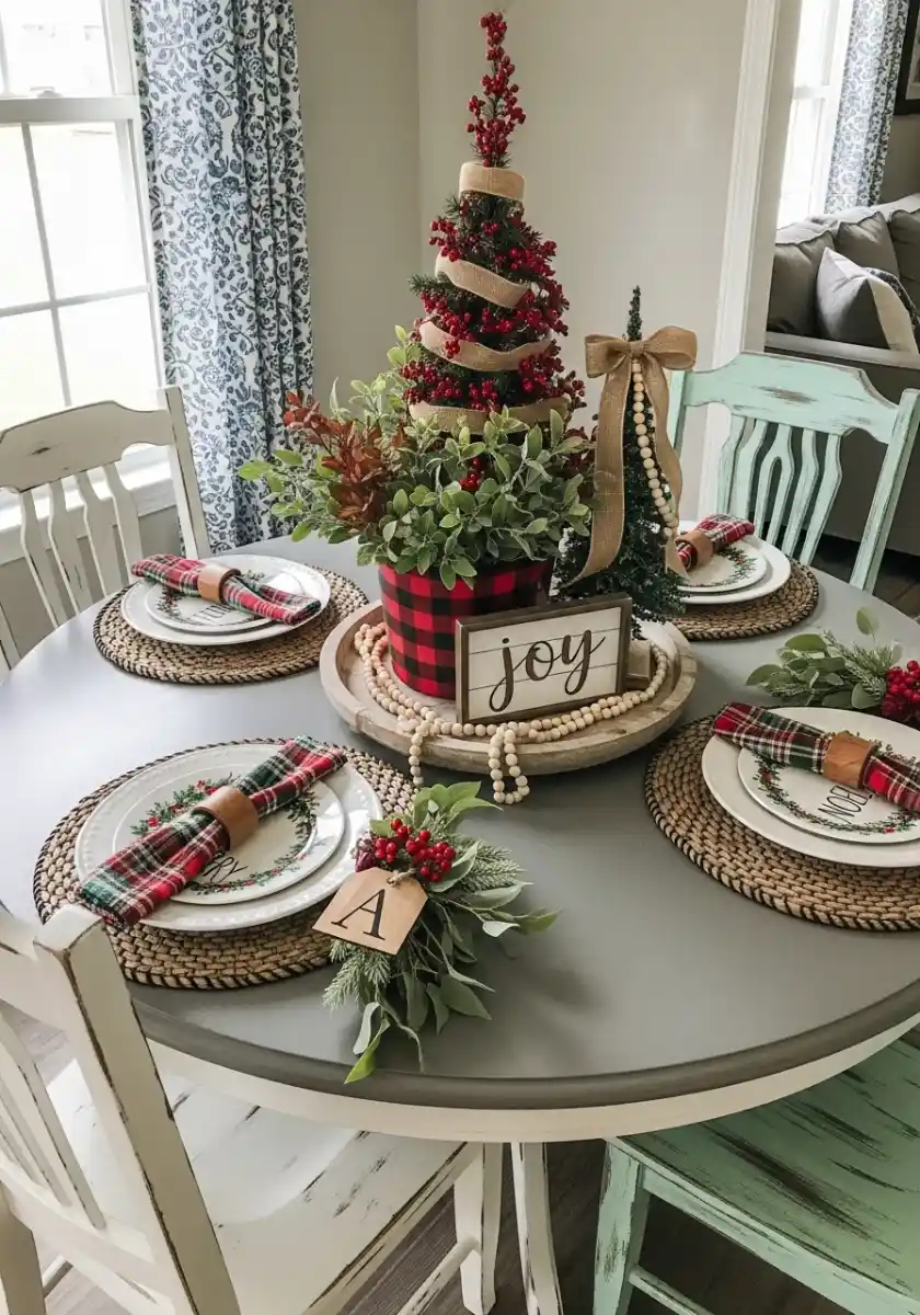 Now we get cozy farmhouse vibes. The middle features a little topiary tree nestled in a buffalo check pot, with a “joy” sign and a strand of chunky wood beads running like a lazy river around it. Woven chargers ground the white plates. Plaid napkins sit in simple leather rings. I love the friendly mix of textures. It feels inviting, like you can grab a cookie and no one will yell about crumbs.