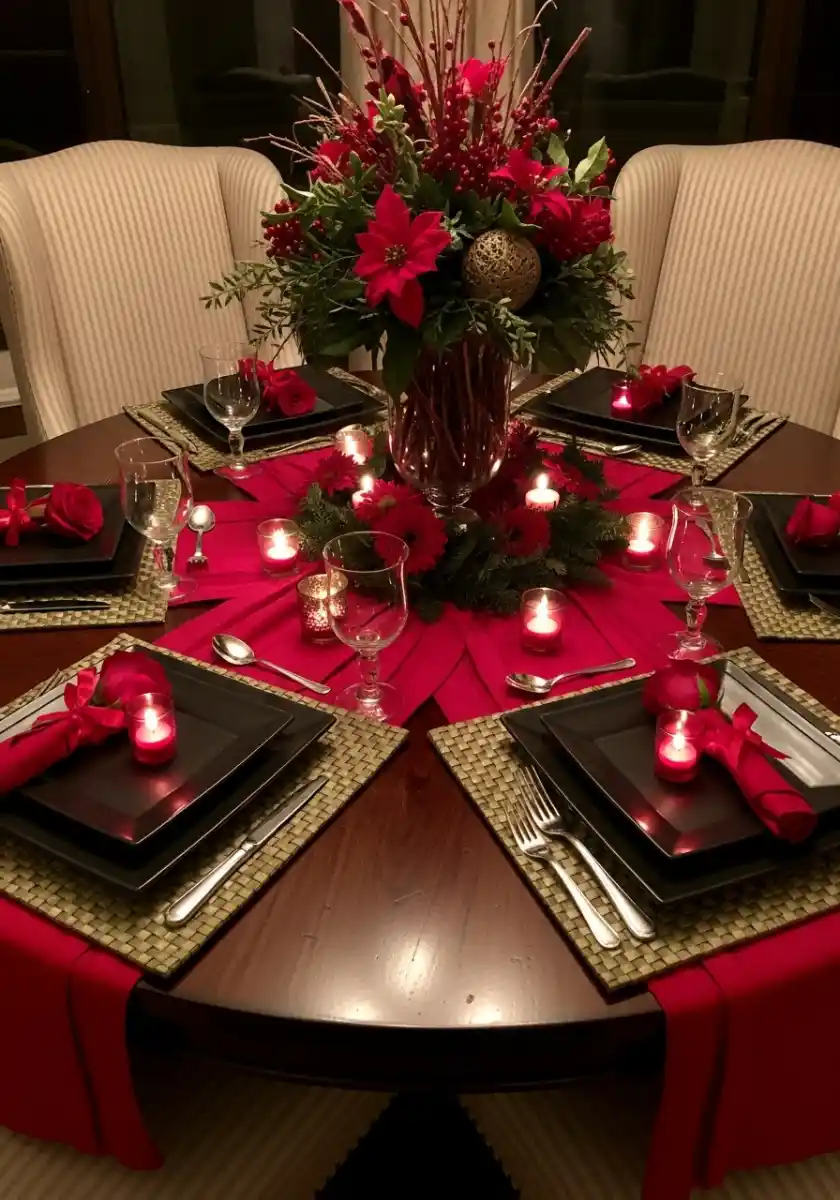 This is the moody dinner look. A deep red tablecloth and a star-burst of folded fabric pieces form a soft base. In the middle, a lush arrangement of red flowers and greens sits in a tall vase. I scattered red votives around it until the whole table looked like a warm ember. Black square plates on woven placemats gave some edge so it didn’t go full Valentine. My honest take. It’s bold, but it feels special, like a fancy hotel dinner at home.