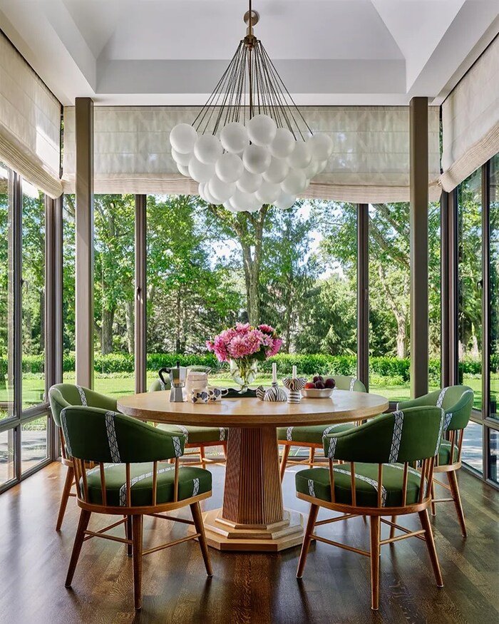 This room feels like a sunroom and a dining room had a baby. The window wall makes the space feel big and bright, and the round table sits in the center like it’s the calm part of the storm. The chairs are dark and simple, which is perfect because the view is already the decoration. This is one of my favorite round table dining room decor tricks: when you have big windows, don’t clutter the room. Let the outside be the art.