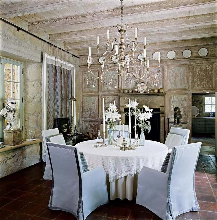 This room is like old-world rustic, but still cozy. The stone and wood walls feel aged and textured, and then the chairs come in with white slipcovers that soften everything. I love that contrast in round table dining room decor. Rough walls plus soft fabric makes the room feel balanced, not too hard.