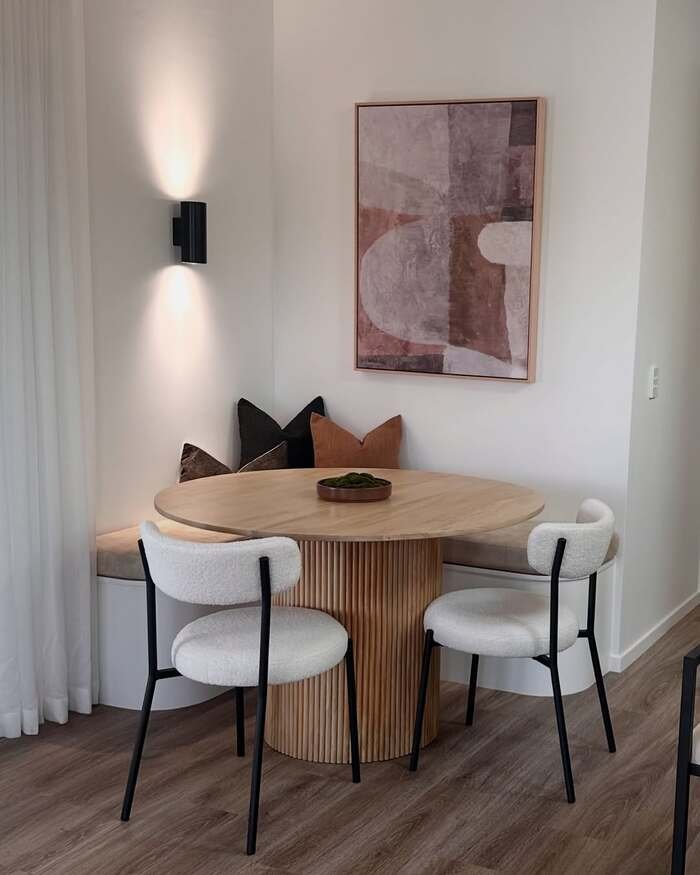 The real win here is the corner banquette with pillows. That’s how you make a tiny spot feel like a hangout zone, not just “a place to eat.” If you want this kind of round dining room table decor, focus on comfort first: bench cushion, 2 to 3 pillows, and wall lighting like that sconce. My hack is: choose pillows with different textures, like velvet and linen, so it looks layered even if the colors are calm.