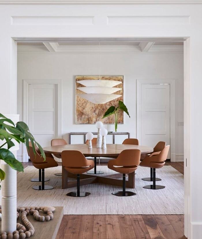 I’m not gonna lie, these caramel chairs made me stop scrolling. They feel playful but still grown-up, like a trendy restaurant but inside someone’s home. The round table is big and sculptural, and the chairs have that sleek base that keeps the floor looking open. This round table dining room decor works because it mixes soft color with strong shapes. It feels modern without being cold.