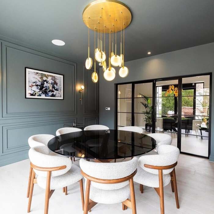 The chandelier is the real personality though. It’s swirly and sculptural, like a piece of modern art hanging from the ceiling. If you want to copy this round dining room decor look, pick one bold thing: either the curtains OR the light. If you do both, keep your chairs simple so you don’t overload the room. Here they kept the chairs clean and mostly neutral, which helps.