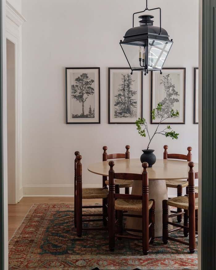 This room feels like a quiet old home in the best way. The chairs have turned wood details, the table is a warm neutral, and there’s a worn-in rug with lots of color. It’s simple, but it has soul. This round table dining room decor vibe is perfect if you like things that feel collected over time, not bought all at once. The light fixture looks like an old lantern, which adds to the classic feeling.