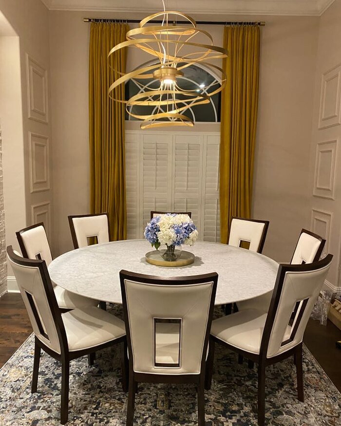 Round table dining room decor with mustard curtains and a sculptural light that feels fun