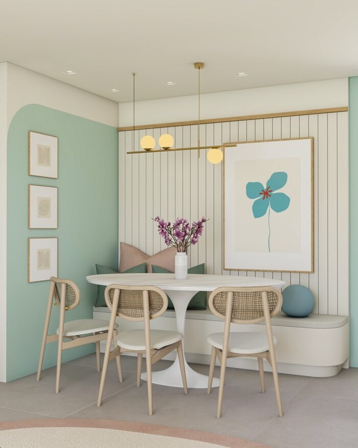 Round table dining room decor with soft mint walls and a curved banquette that feels playful
