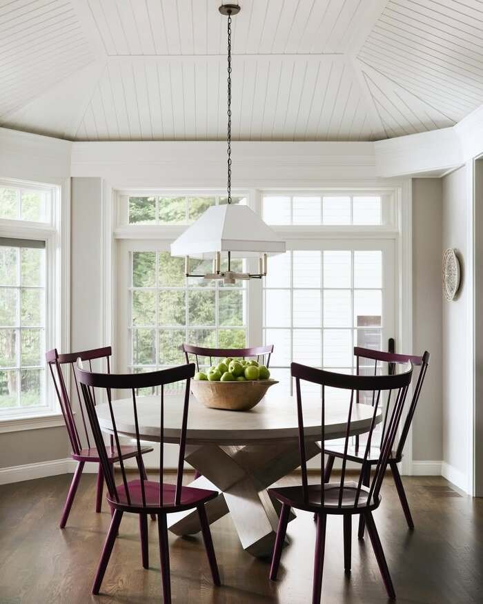 The ceiling beams painted white are also a smart touch. They add texture without adding darkness. And the big windows make the whole thing feel open. If you want this style of round dining room decor, keep your color palette tight: white, beige, soft wood, and one green plant for life.