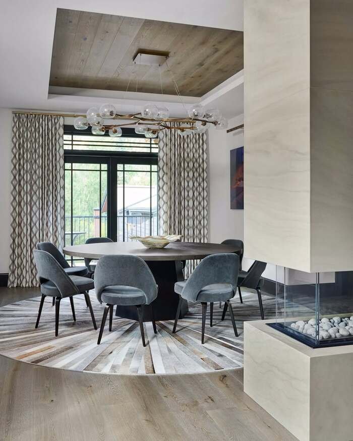 This room is modern and clean, but it still feels comfortable because of that rug. The rug has a big radiating pattern, almost like a sunburst, and it frames the round table perfectly. This is a strong round table dining room decor move because round tables love round rugs, and round rugs love being the center of attention.
