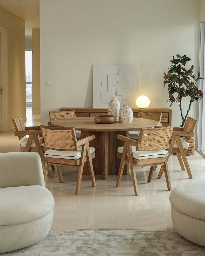 This one is calm. Like, “my brain feels quieter now” calm. The round table is wood, the chairs have cane backs, and the whole color palette is soft and sandy. This is round table dining room decor for people who hate visual clutter. The decor is simple, but it’s not boring because the textures do the work.