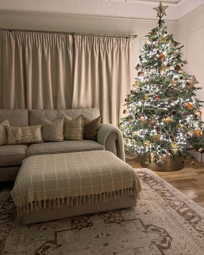 To copy this rustic holiday decor at home, try a single metallic for ornaments and mix in unfinished wood. If your sofa is gray or beige, toss on one nubby knit blanket and two tone-on-tone pillows. Slide a woven basket with firewood or faux logs beside the tree. That little move screams woodland Christmas decor without buying another ornament. Also, dim overhead lights and let the tree do the work. Instant cabin feeling.