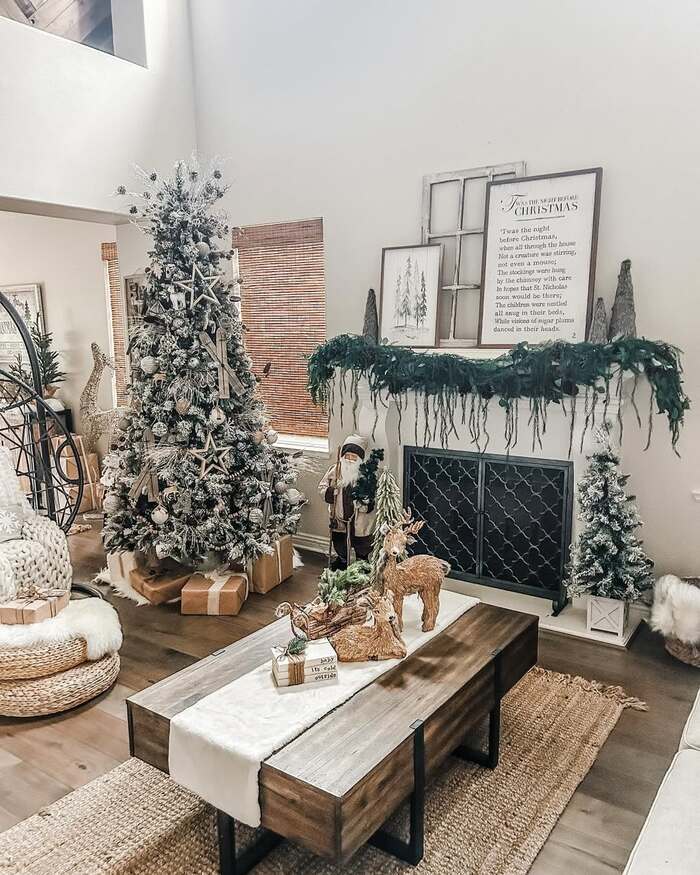 Our last room goes soft and snowy with a flocked tree, white garland, and sun-washed woods. The fireplace is simple, and the wreath above the round mirror is everything. It’s calm, which might be the real gift. Rustic christmas decor does not always mean dark wood and plaid. Sometimes it’s space to breathe.