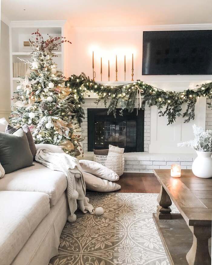 This light, calm living room is proof that rustic christmas decor can be soft and still feel magical. The frosted tree leans into neutrals, but notice the mix of textures. Matte ornaments, velvet bows, and iced branches sparkle against the white brick fireplace. The garland isn’t perfectly symmetrical. It drapes a little lower on one side, which reads natural, like it was just snipped from outside. I’m big on candles, but I learned to group them in odd numbers on the mantel for that lived-in farmhouse Christmas decor vibe.