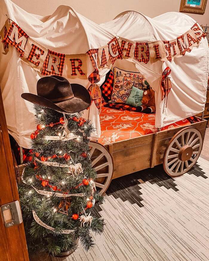 I didn’t expect to fall for a covered wagon bed, yet here we are. This kids’ nook is playful country Christmas decor at its cutest. The flannel banner, tiny evergreen with wood bead garland, and the cowboy hat on top make it feel like a storybook. There’s pattern, but it’s controlled. Red checks show up three times, which keeps your eye steady.