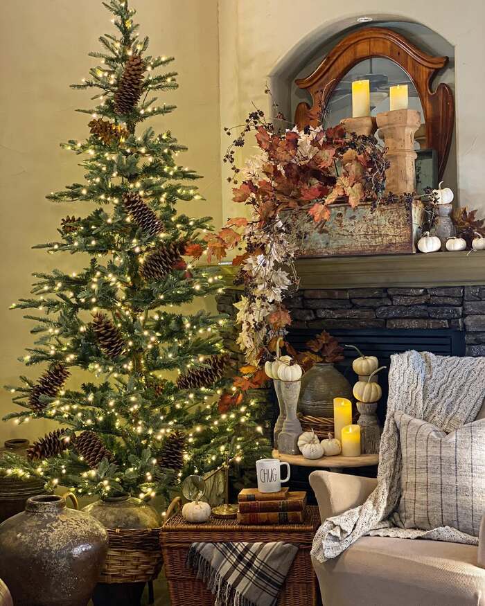 I’m forever late taking down fall. Here’s my trick. This room uses extra large pinecones on the tree and an earthy, amber garland on the mantel. Keep your fall branches, but pull the pumpkins. Add twinkle lights and pinecones, then drop in a few snowy stems. The room turns from harvest to woodland Christmas decor in one hour. Those mega cones are usually called sugar pine cones. You can wire them straight to the branches or hang them with leather cord.