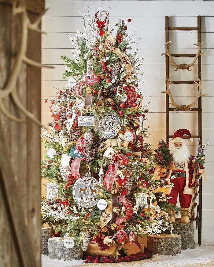 Here’s the loud cousin of rustic christmas decor, and I love it. The tree is loaded with plaid ribbons, lodge-style signs, tiny sleds, and frosted berries. A wood ladder and vintage Santa stand nearby. It’s busy, but like a busy diner, the energy feels joyful. Kids go crazy for it.