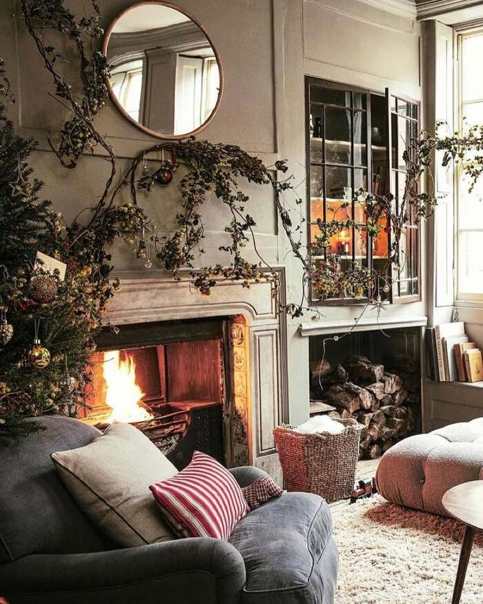 Ok, this one made me gasp. A simple tree peppered with oversized pinecones and warm white lights, styled next to chunky pottery and a stone fireplace. It’s woodland Christmas decor that’s moody in the best way. The pinecones act like ornaments but larger, which means you don’t need as many other pieces. Less fuss, more wow.