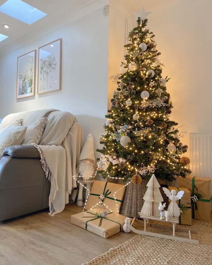 Copy this rustic Christmas theme with pale woods, white candles, and restrained ornaments in cream and gold. Keep the tree skirt simple, like a basket or a linen drop cloth. A jute rug or chunky pouf will add texture. My only rule here, let the greenery be the star. The more muted the rest of it is, the more the pine feels special. It’s a soft take on rustic winter decor that still photographs beautifully for your family album.