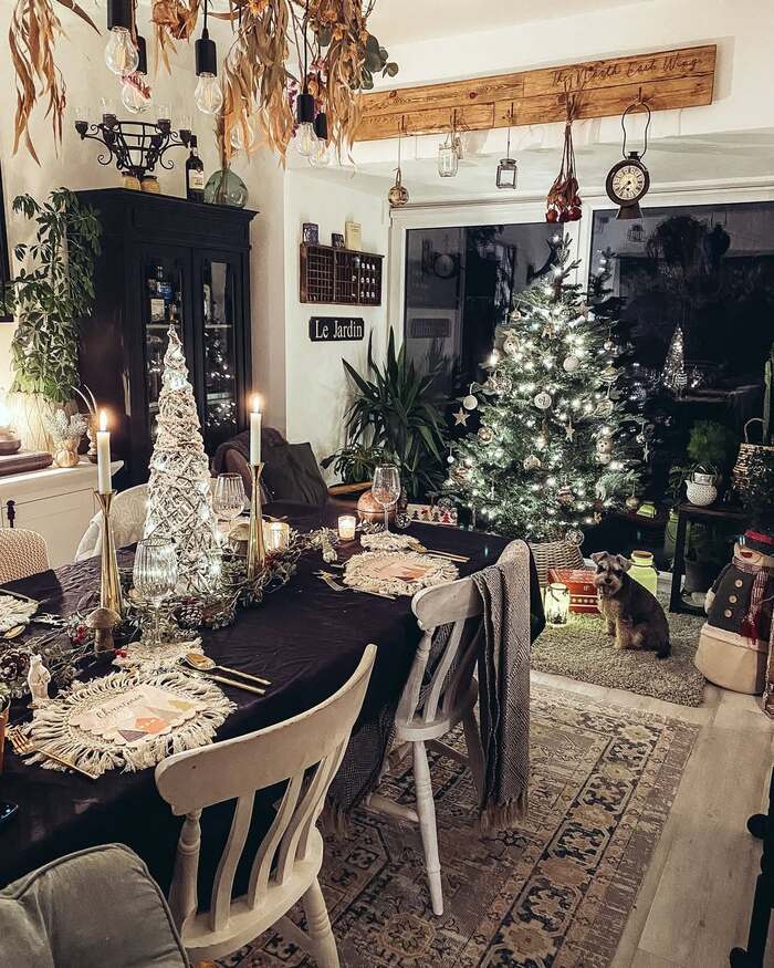 This dining room hits me right in the feelings. The table is layered with a dark cloth, brass candlesticks, and woven placemats. Overhead, dried botanicals hang from a rustic beam. On the side, a modest Christmas tree glows next to a pup who clearly knows good vibes. The whole thing is rustic festive decor without trying too hard.