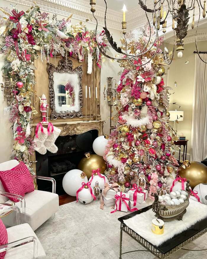 Confession time. The pink and gold room looks like a dessert cart crashed into a tree. It’s stunning, but not my everyday. Still, there’s a trick here for rustic decor for Christmas. Under all that glam there are natural shapes. If you reduce the metallics and bump up the greens, the bones give you a romantic rustic Christmas theme.