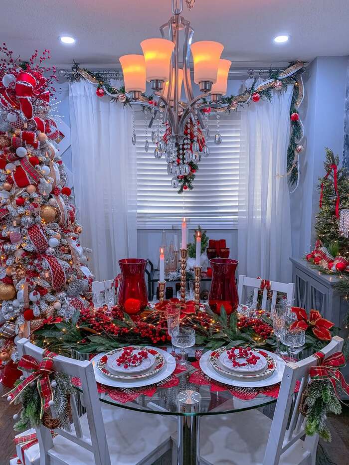 The round glass table with red berries and tall tapered candles feels joyful, like someone shouted Merry Christmas and meant it. A candy-cane tree stands guard nearby. This is not subtle, but it’s happy, and sometimes happy is the only rule. The sparkle on the chandelier bounces light everywhere which makes the small room feel bigger.