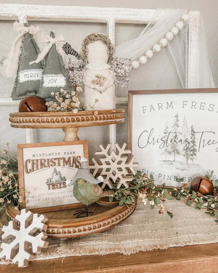 I can’t leave out the two-tier tray. It’s small but it teaches an entire course on rustic Christmas decorations. The tiny bird, wood snowflakes, and vintage-style signs look like you wandered a flea market and got lucky. That mix of natural wood, soft white, and a tiny bit of green is foolproof.